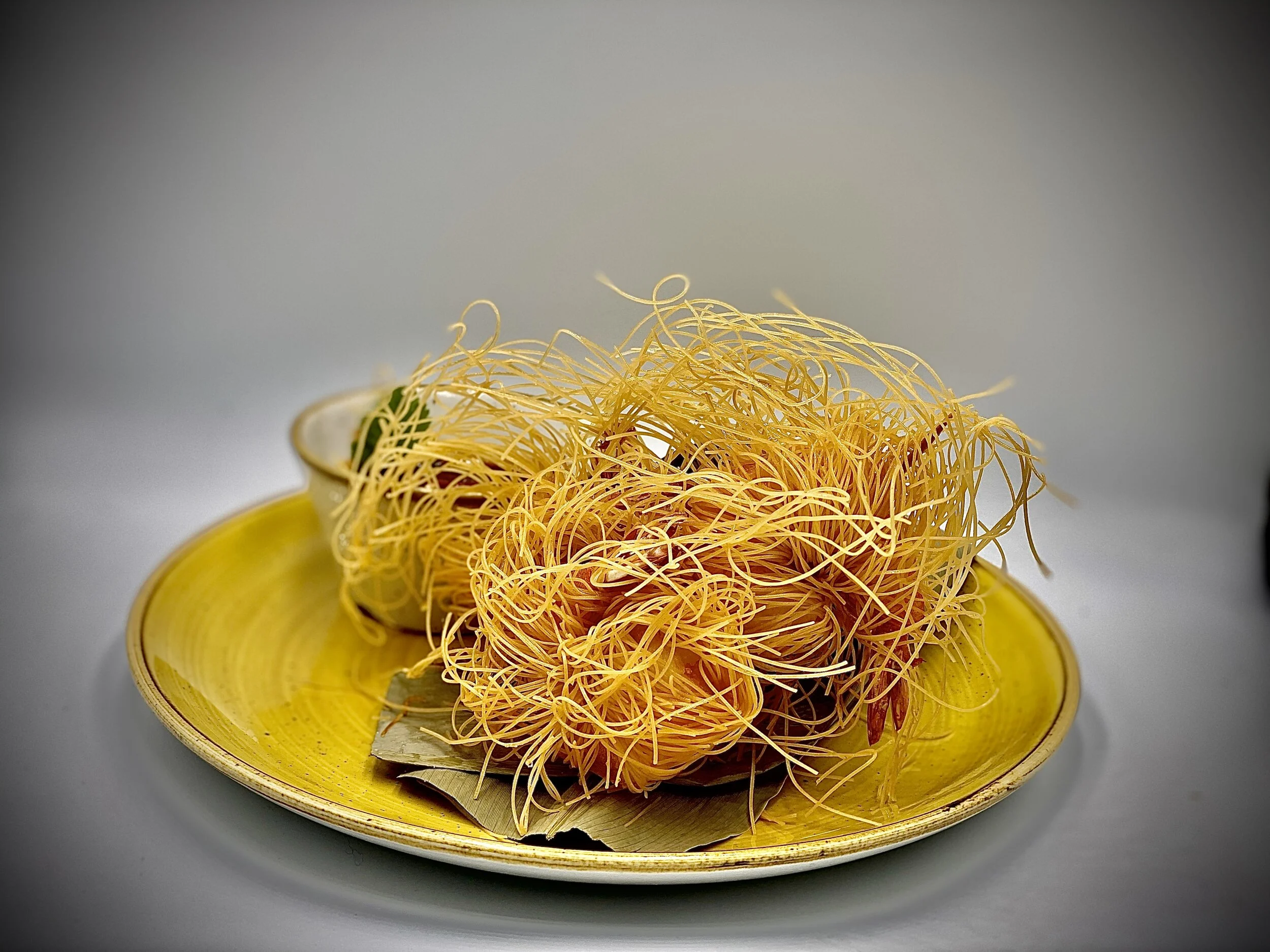 Grilled prawns served on cha-pruu leaves (Betel) topped with roasted coconut, peanuts, ginger, shallot, chilli, lime, drizzled shrimp paste and palm- sugar dressing